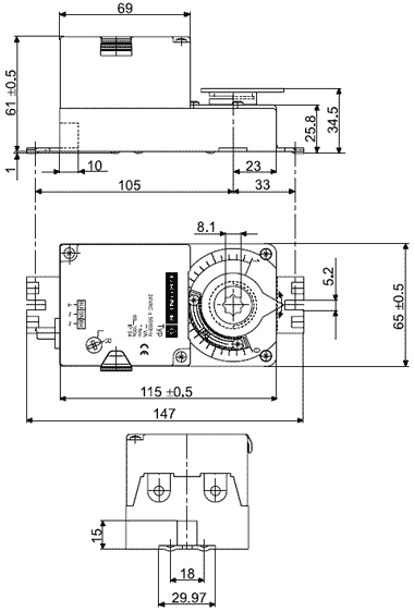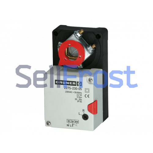 Introducing the Gruner 227SZ-230-05-P5 with a 5 Nm torque, this electric drive is specifically designed for use with air dampers and valves in ventilation systems. It features a manual control button and a mechanical angle limit switch for precise control. With its square shaft mount, it's easy to install and compatible with various applications.